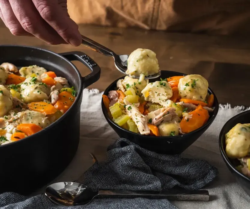 7. Decrease Traeger temperature to 275°F and drop the mixture into the simmering broth with a spoon. Simmer, covered, until the dumplings are cooked, about 15 to 20 minutes. Serve the chicken and dumplings sprinkled with additional parsley for garnish. Enjoy!